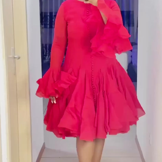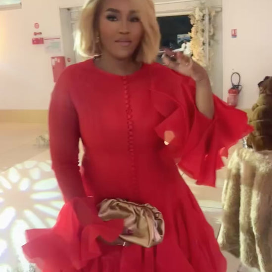 • Spectaculaire et élégante avec ses manches bouffantes et ses volants en cascade, cette robe apporte volume, mouvement et glamour. Parfaite pour briller lors d’un événement spécial.