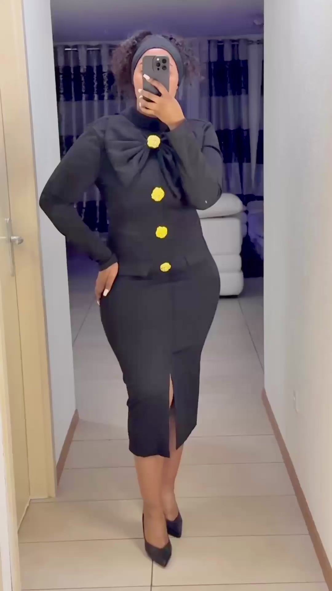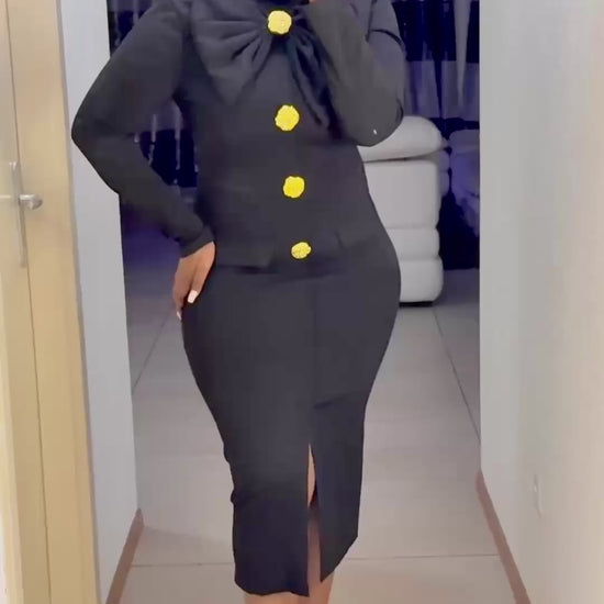 • Une allure de femme d’affaire dans ce look, robe avec manche longe et détails à lavant, petite fente sur l’avant également.